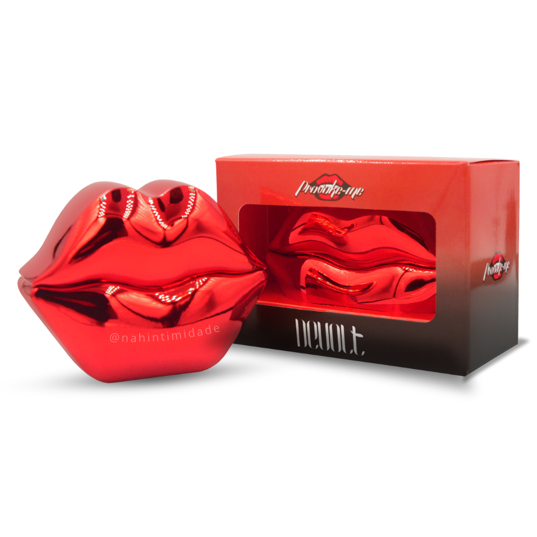 • Frasco em formato de lábios vermelhos metálicos, sofisticado e provocante, simbolizando sedução e empoderamento.
